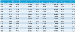 A: The primers target the V3/V4 region. You can determine this by conducting a Google search of the primers or by reading the Novogene’s documents. From the literature the target region is 440 bp, the same as for the Psomagen example. If we merge the trimmed sequences with usearch -fastq_mergepairs the mean merge length is 418.52 base and the mean alignment length is 32.48. For usearch, the default minimum over lap length is 16. If we set this to 12 instead with the fastq_minovlen parameter, the stats are the same.